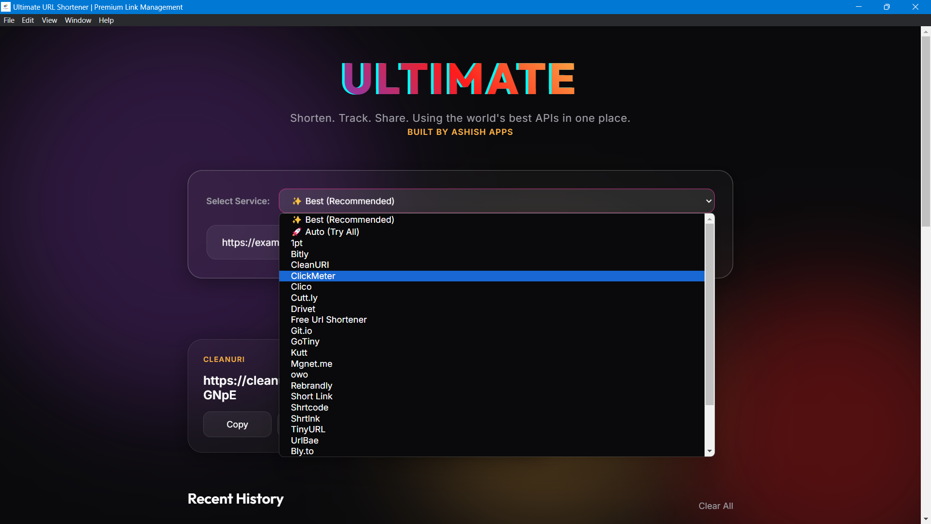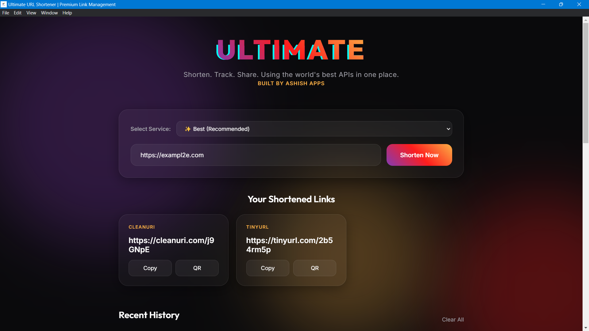 - Local Privacy History: Keep track of your last 10 shortened links with our sleek history panel. Your data stays on your machine, giving you quick access without compromising privacy.