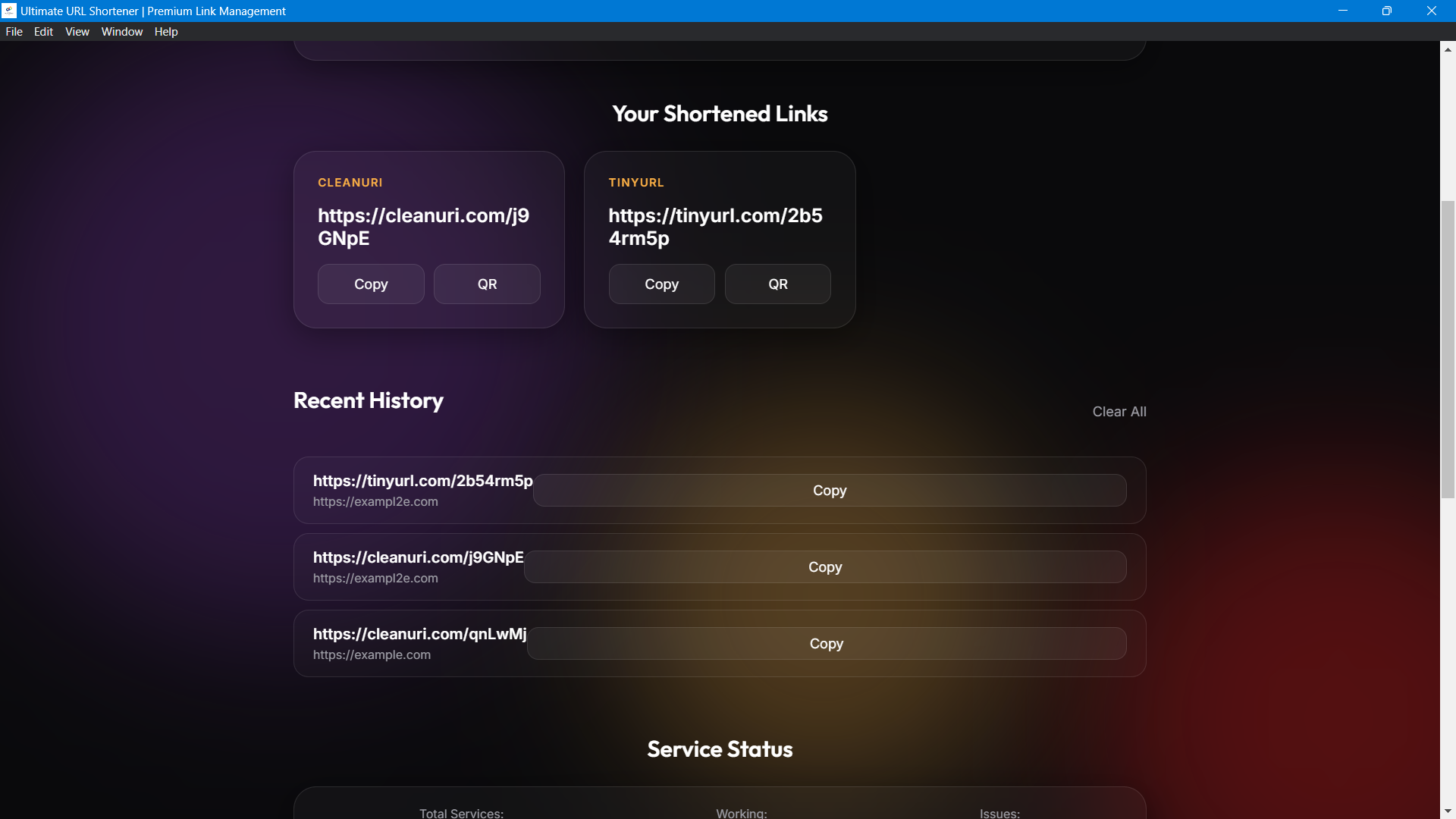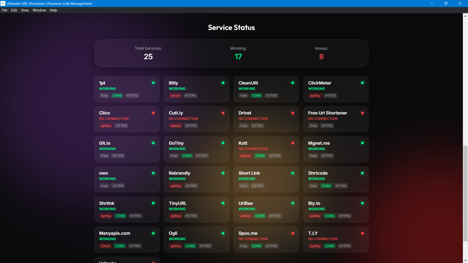 - Real-Time Service Status: Our live dashboard monitors the health of over 20+ APIs (including Bitly, Kutt, and Rebrandly). You’ll know exactly which services are online before you ever click "Shorten."