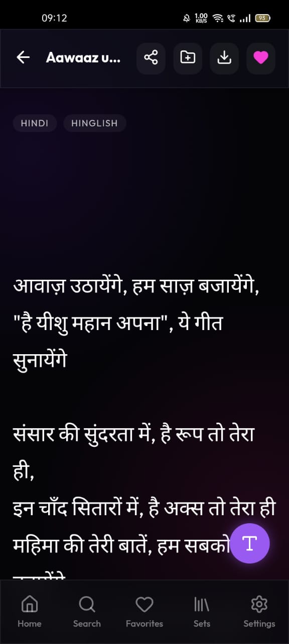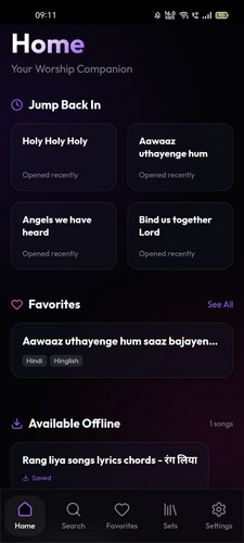Yeshu Geets allows users to save lyrics for offline access, so worship does not stop when the network does.